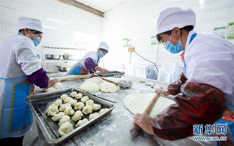 在西吉縣田坪鄉(xiāng)中心小學(xué),食堂的工作人員在制作午餐面點(diǎn)(10月23日攝)。(新華社發(fā) 楊植森/攝)