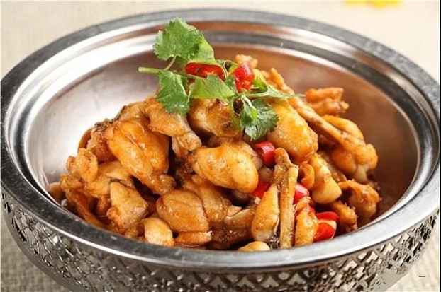4、鍋滑透,留少許底油燒熱,下蒜末、姜末、干紅辣椒段炸香,調(diào)入自制干鍋醬10克、鹽1克、味精2克、雞粉3克炒勻,倒入炸好的牛蛙塊快速炒勻防止回軟,再調(diào)入味精3克翻勻,起鍋盛入墊有菜料的盛器中上桌即可。
