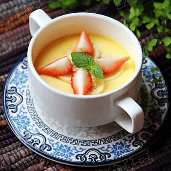 6、蒸好的蛋羹上面放上一些切好的草莓和香蕉即可食用。
